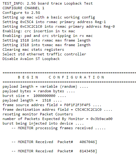 Table 11. Command Parameters Parameter Valid Values Description channel 0, 1 The channel number to test. speed 1G, 2.5G The PHY speed. burst_size An integer value The number of packets to generate for the test. - When the test is completed, observe the output displayed. The following diagrams show excerpts of the output, which shows that the Ethernet packet monitor block receives the same number of packets generated without error, and the TX and RX statistics counters.