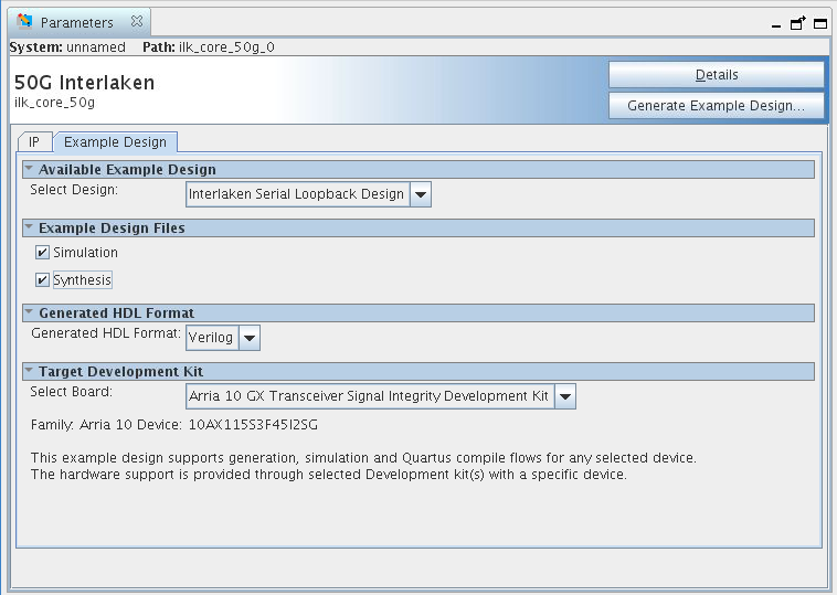 - For Target Development Kit select the Intel® Arria® 10 GX Transceiver Signal Integrity Development Kit. If you select a development kit, then the target device (selected in step 4) for Example Design is changed to match the device on target board.