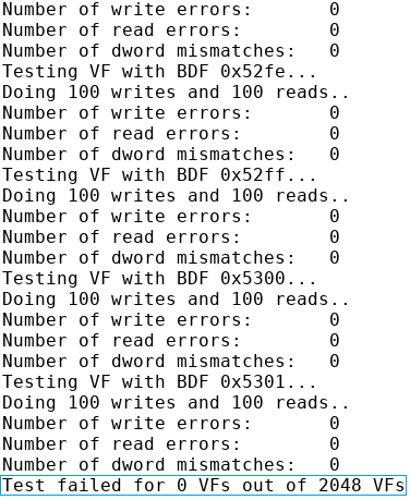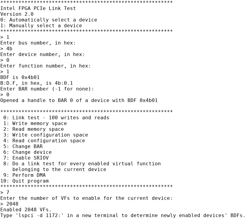 - Enter option 8 to perform a link test for every enabled virtual function allocated for the physical function. The link test application will do 100 memory writes with a single dword of data each and then read the data back for checking. The application will print the number of virtual functions that failed the link test at the end of the testing.