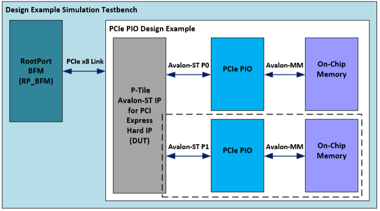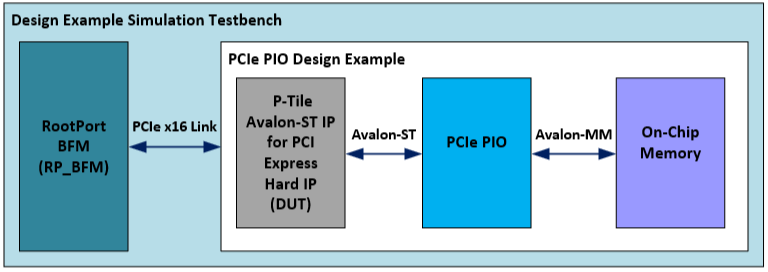 The simulation testbench instantiates the PIO design example and a Root Port BFM to interface with the target Endpoint.