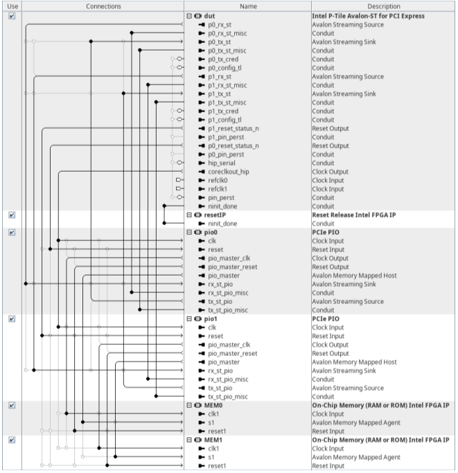 Figure 4.  Platform Designer System Contents for P-Tile Avalon® Streaming PCI Express 2x8 PIO Design ExampleThe Platform Designer generates this design for up to Gen4 x8x8 variants.