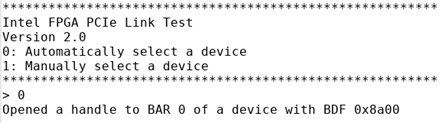 • In automatic mode, the application automatically selects the device. The test selects the Intel PCIe device with the lowest BDF by matching the Vendor ID. The test also selects the lowest available BAR.