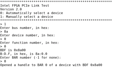 • In manual mode, the test queries you for the bus, device, and function number and BAR.