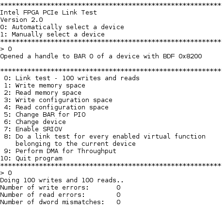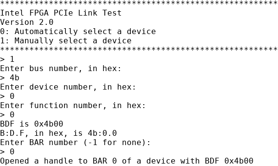 You can run the Intel® FPGA IP PCIe* link test in manual or automatic mode. Choose from:- In automatic mode, the application automatically selects the device. The test selects the Intel PCIe* device with the lowest BDF by matching the Vendor ID. The test also selects the lowest available BAR.