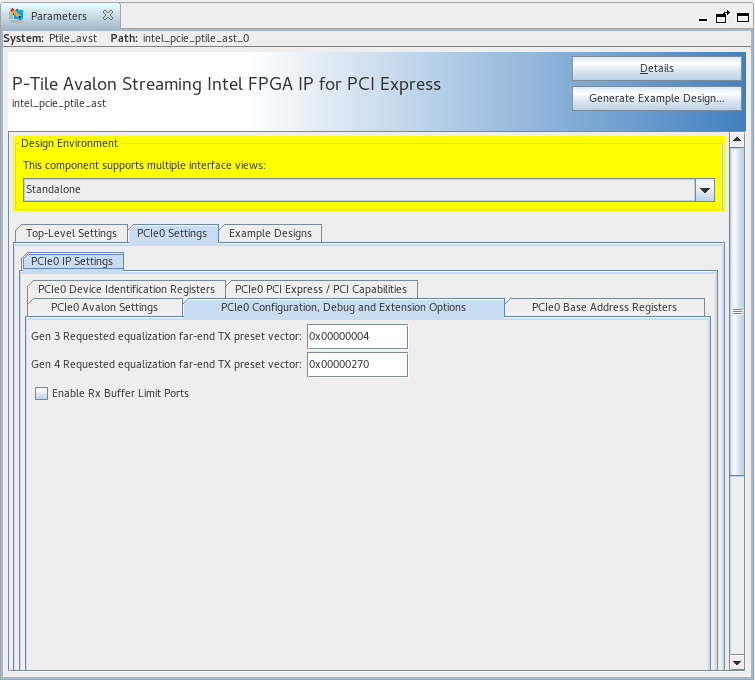 | Strip ECRC | True/False | False | Strip off the ECRC field from the TLP payload when the TD bit is set. Note that this option is only available in the TLP-Bypass mode. |