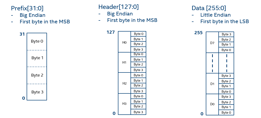 The ordering of bytes in the header and data portions of packets is different. The first byte of the header dword is located in the most significant byte of the dword. The first byte of the data dword is located in the least significant byte of the dword on the data bus.