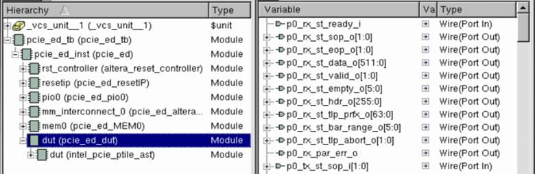 To add waveforms, select a component (e.g. dut) in the Hierarchy pane, select signals in the Variable pane, and then add them to the Wave pane.