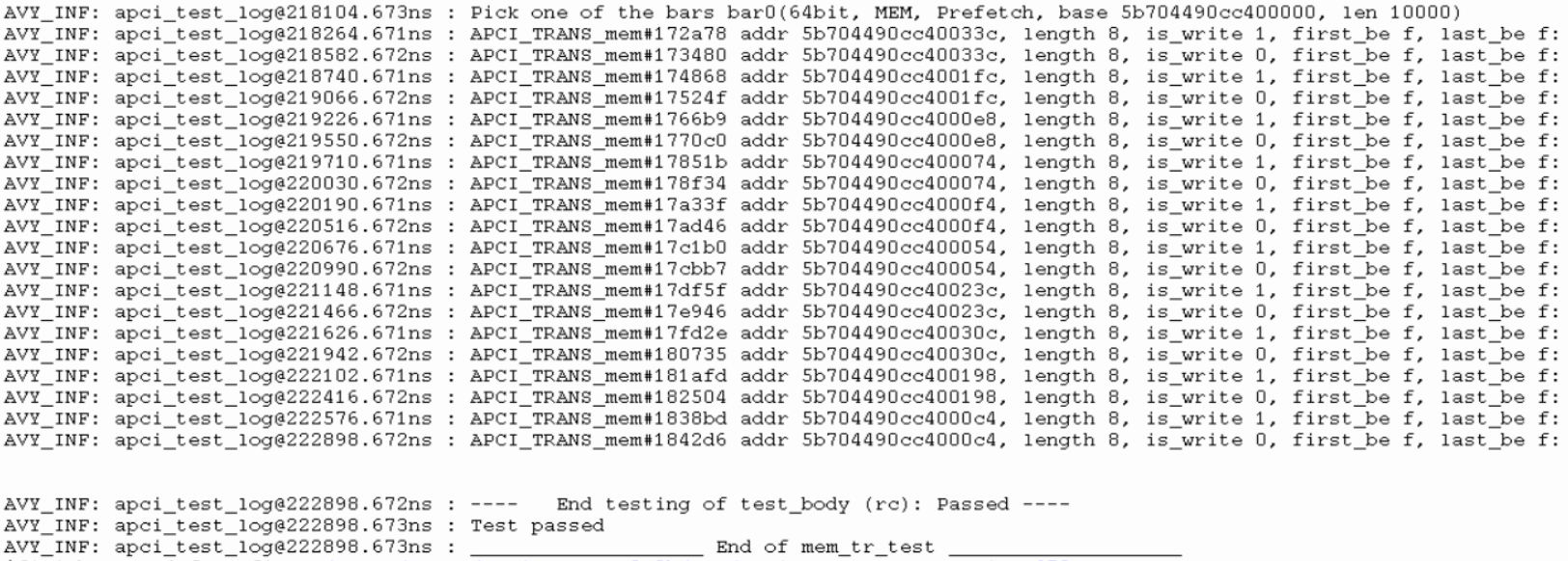 The Avery BFM includes a memory transaction test that runs a sequence of 10 memory write/read combinations, where the test writes to a memory location and immediately reads back from the same location. For details on the test, refer to mem_tr_test class in apci_top_rc.sv. When the test passes, the following is displayed: