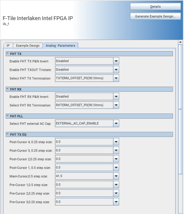 From Intel® Quartus® Prime Pro Edition Software version 23.3 onwards, a GUI based mechanism is implemented to set the analog parameters of F-tile transceivers. The figures below show the FGT and FHT Analog Parameters Tab.