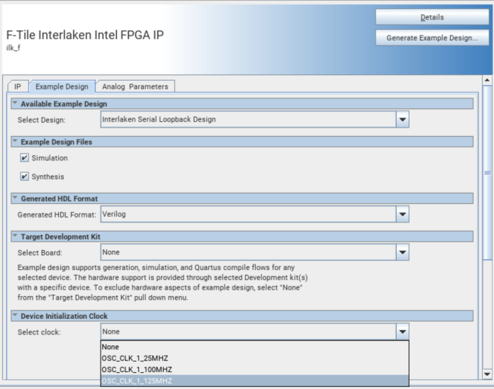 - On the Example Design tab, select the Simulation option to generate the testbench. Select the Synthesis option to generate the hardware design example. You must select at least one of the Simulation and Synthesis options to generate the design example.