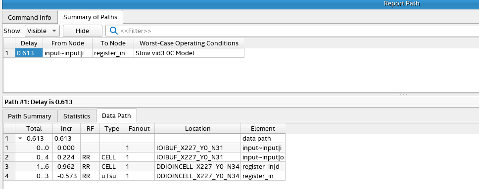 In the following example, Report Path shows the maximum delay of input pin to register for the Slow mode at 0C Model operating condition.
