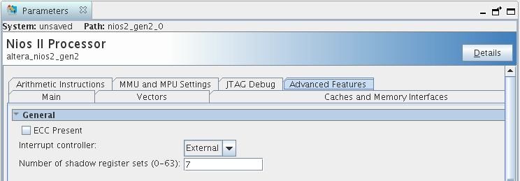 This section describes how to add the EIC interface and shadow register sets to a Nios® II processor core in Platform Designer, through the parameter editor interface.