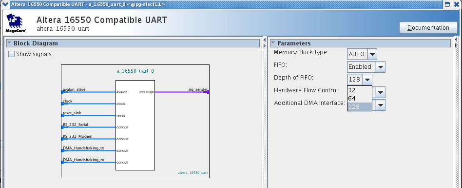 The figure below shows the Platform Designer setup on the 16550 Soft-UART's FIFO Depth