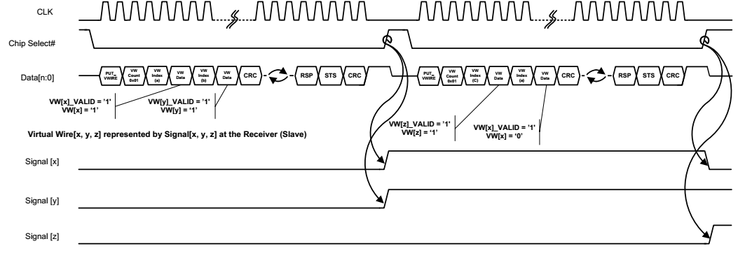 To assert the output ports that connect to the Virtual Wire channel, the eSPI host issues a PUT_VWIRE command, assigns a Virtual Wire count value, assigns the Virtual Wire index of the corresponding output port, and follows that up with a byte of data and CRC.