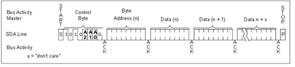 Upon receiving of the agent address with the R/W bit set to zero, the bridge issues an acknowledge to the I2C host. The next byte transmitted by the host is the byte address. The byte address is written into the address counter inside the bridge. The bridge acknowledges the I2C host again and the host transmits the data byte to be written into the addressed memory location. The host keeps sending data bytes to the bridge and terminates the operation with a Stop condition at the end.