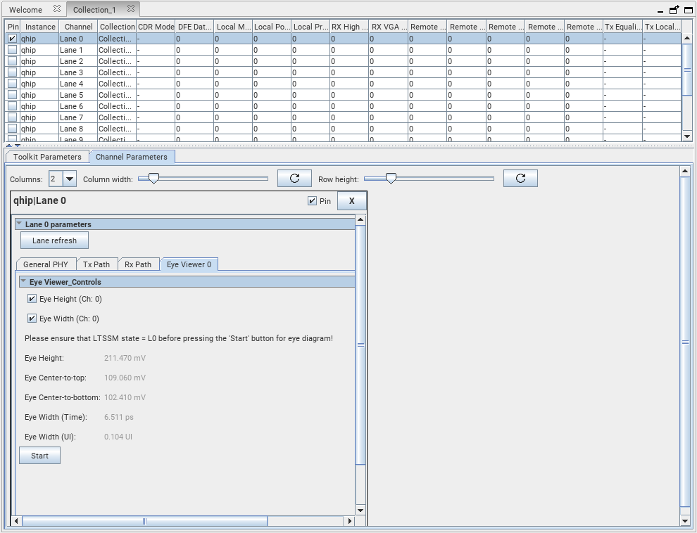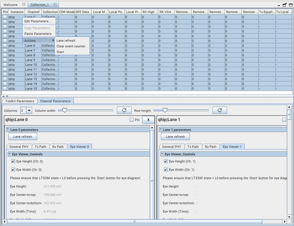 To reduce the repetitive steps to run eye viewer for more than one lanes, select the lanes from the Collection table, right click and select Start. The eye viewer runs for the selected lanes sequentially.