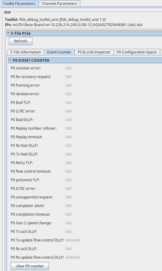 This tab allows you to read the error events like the number of receiver errors, framing errors, etc. for each port. You can use the Clear P0 counter/Clear P1 counter to reset the error counter.