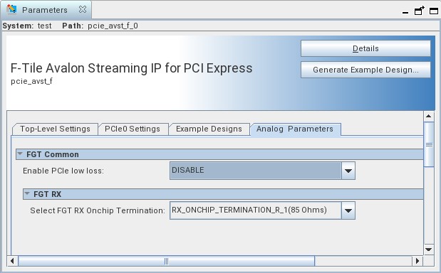 | Select FGT RX Onchip Termination | RX_ONCHIP_TERMINATION_R_1 (85 Ohms) RX_ONCHIP_TERMINATION_R_2 (100 Ohms) |