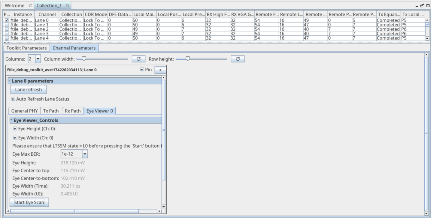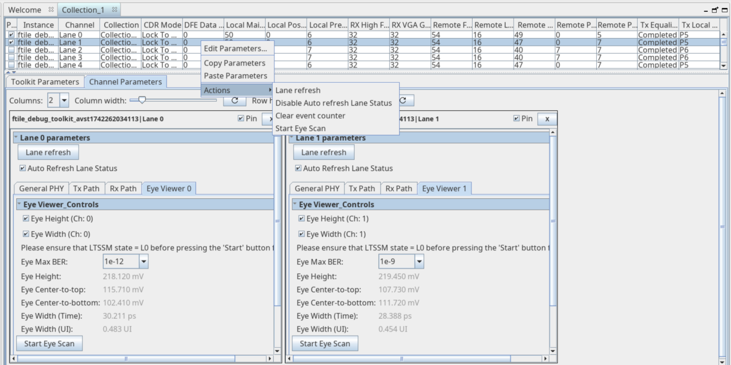 To reduce the repetitive steps to run the Eye Viewer for more than one lanes, select the lanes from the Collection table, right click and select Start Eye Scan. The Eye Viewer runs for the selected lanes sequentially. Note that these steps are applicable for a BER of 1e-12 only.