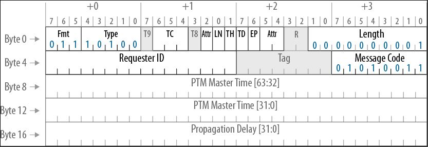 In the 2nd PTM dialog, the Downstream Port populates the PTM ResponseD message based on timestamps stored during previous PTM dialogs, the format is shown in the second figure below. It contains PTM Master Time which is t2’ and propagation delay which is t3-t2.