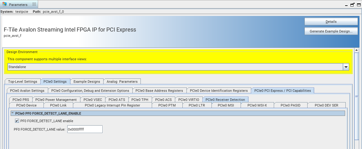 | PF0 FORCE_DETECT_LANE enable | True/False | False | Force Detect Lane Enable. When this option is set, the controller ignores receiver detection from PHY during LTSSM Detect state and uses FORCE_DETECT_LANE value. |