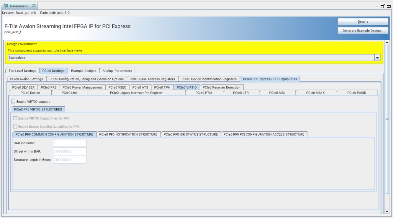 | Enable Device Specific Capability for PF0 | True/False | False | Enables Device Specific Capability for VIRTIO Device on PF0 |