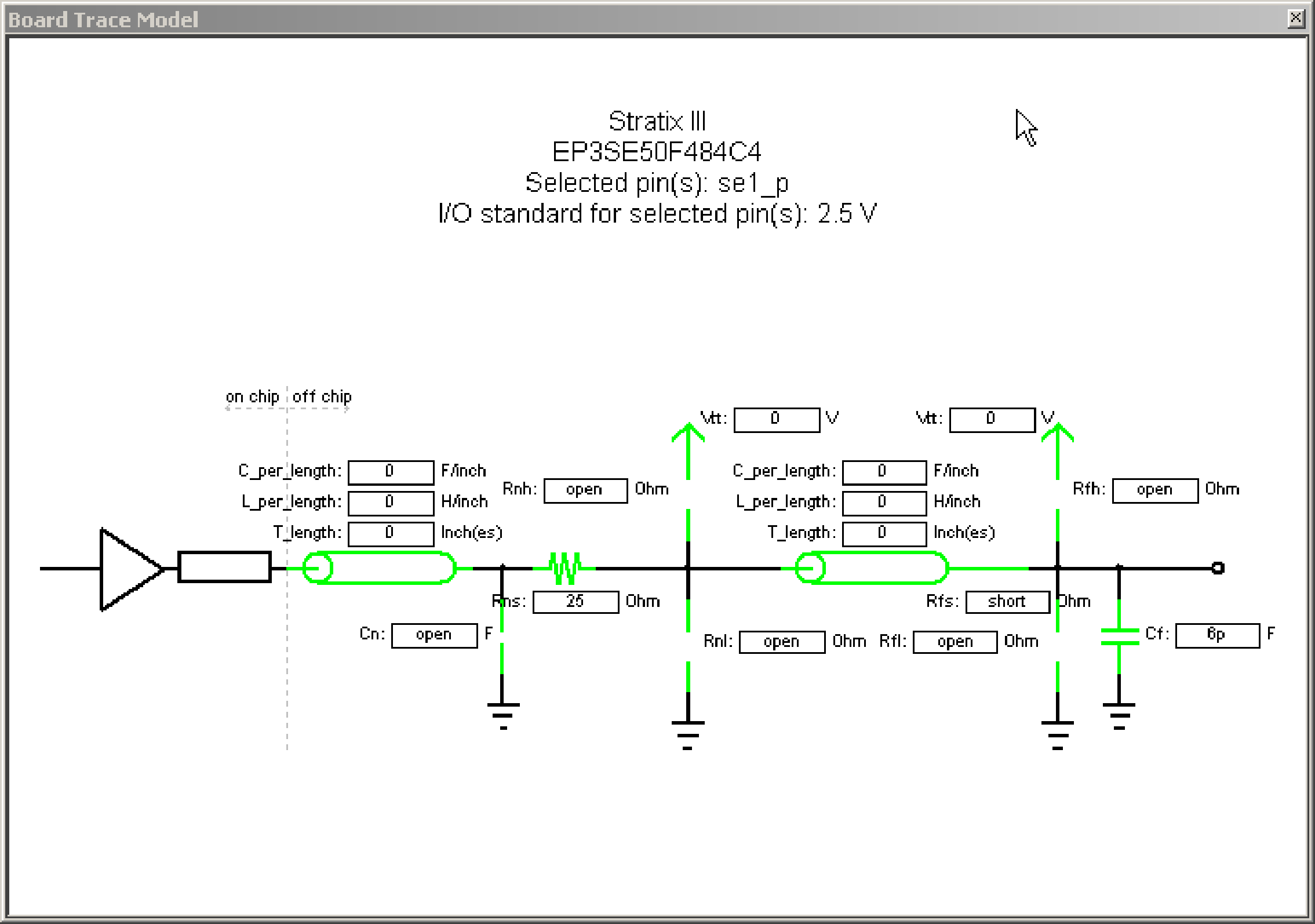 The following figure shows the template for a 2.5 V I/O standard. This model consists of near-end and far-end board component parameters.