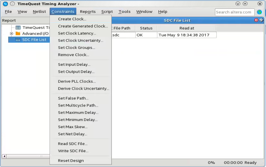 You can specify timing constraints in the Timing Analyzer GUI. Click the Constraints menu in the Timing Analyzer to specify timing constraints that you can apply to your project.