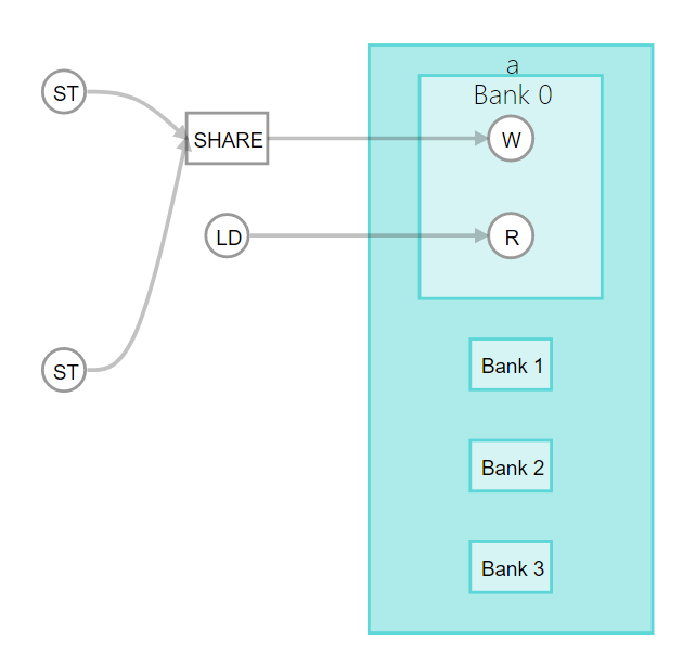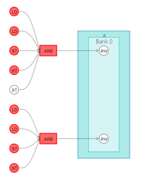 As illustrated in the following figure, this code example generates multiple load and store instructions, and therefore multiple load/store units (LSUs) in the hardware. If the memory system is not split into multiple banks, there are fewer ports than memory access instructions, leading to arbitrated accesses. This arbitration results in a high loop initiation interval (II) value. Avoid arbitration whenever possible because it increases the FPGA area utilization of your component and impairs the performance of your component.