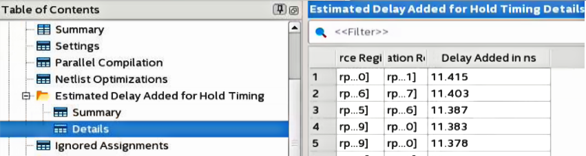 - To see a list of the 10 paths with highest delay in the design, in the Reports pane find Fitter Summary Report > Estimate Delay Added for Hold Timing > Details.