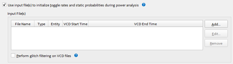 - To enable glitch filtering during power analysis with the .vcd you generate, turn on Perform glitch filtering on VCD files.