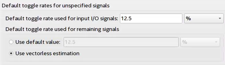 You can specify the Default toggle rates for unspecified signals in your design for power analysis. The Power Analyzer uses the default toggle rate when no other method specifies the signal activity data.