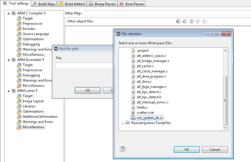 - Add the FPGA object file in the Miscellaneous settings section.