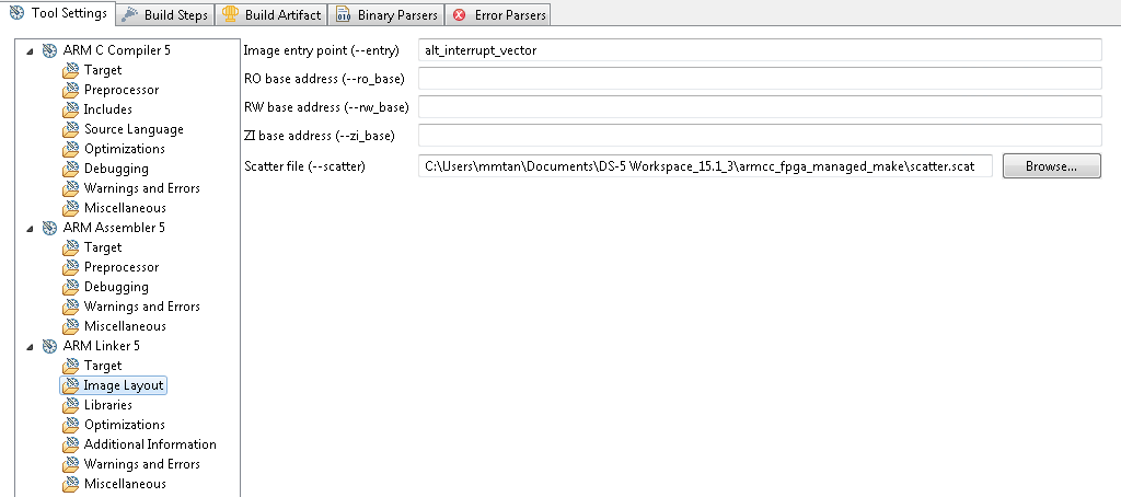 - "Define the Image entry point (--entry) as "alt_interrupt_vector" and add the Scatter file (--scatter) location in the "Image Layout" section.