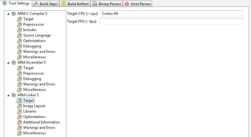 - Define the “Target CPU (--cpu)” as “Cortex-A9” in the Target section.