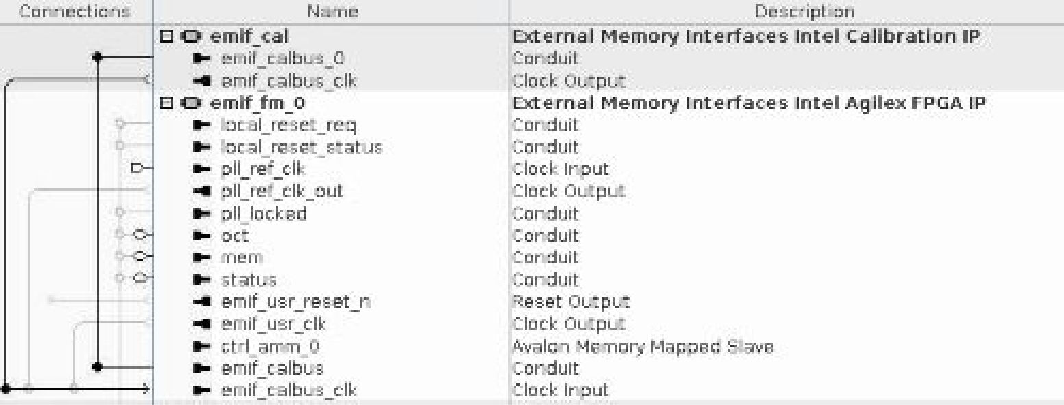 Each EMIF instance must be connected to the I/O SSM through the External Memory Interfaces Calibration IP. The Calibration IP exposes a calibration bus master port, which must be connected to the slave calibration bus port on every EMIF instance.