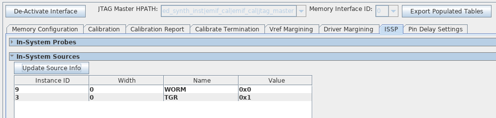 To reread the source data from the ISSPs in the design, expand the In-System Sources section and click the Update Source Info button.