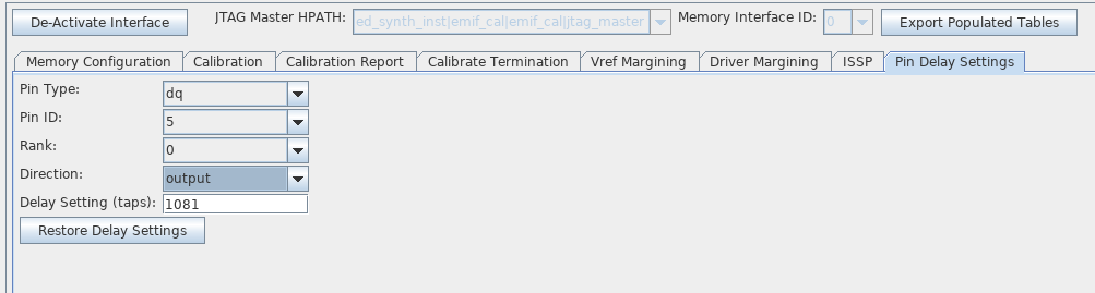 You can select the Pin Type, Pin ID, Rank, and Direction values of a delay that you are interested in, and the toolkit displays the delay value in the Delay Setting (taps) field.