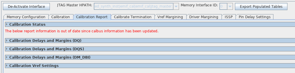 If you make changes to Delay Setting (taps) the delay value is updated in hardware. After the value changes in hardware and no longer matches the setting found in calibration, you receive a warning message indicating that the margins in the Calibration tab are out-of-date.