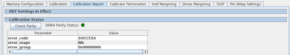 The Calibration Status Report displays the calibration status and memory parity (ALERT_N) status. If a failure occurs, this report shows the first stage of calibration that failed, as well as the data groups that failed at this stage. Memory parity status observed during calibration is shown for DDR4 interfaces if ISSPs are enabled in the design. The calibration status report window contains a status indicator for memory parity and a button that allows you to reread memory parity status.