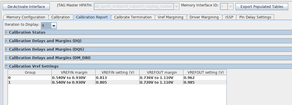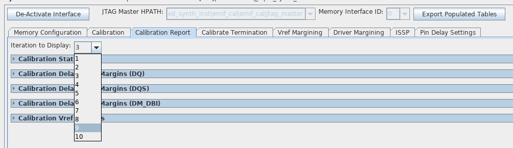 You may choose to view the Status, Delay Settings, or Margins reports for any of the most recent calibration iterations initiated through the toolkit. To select the iteration to view, select from the Iteration to Display dropdown menu.