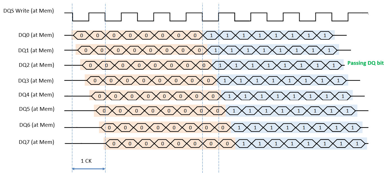 Write leveling occurs before write deskew, therefore only one successful DQ bit is required to register a pass. Write leveling staggers the write DQ bus to ensure that at least one DQ bit falls within the valid write window.