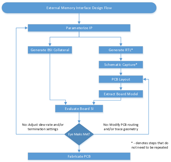 The board signal integrity flow allows you to iterate your design quickly if necessary. You can make adjustments to signal integrity settings such as slew rate, deemphasis, drive strength, or read termination in the parameter editor, and rerun the simulations with the new IP-specific SPICE parameter file. If you cannot achieve mask compliance by modifying the IP, then you can re-route the critical areas of the PCB and repeat the simulation using the updated extracted model.