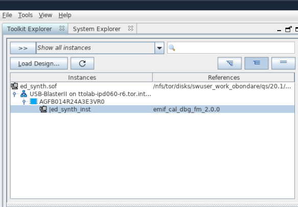 - In the System Console, load the SRAM Object File (.sof) with which you programmed the board in Prerequisites for Using the EMIF Debug Toolkit.