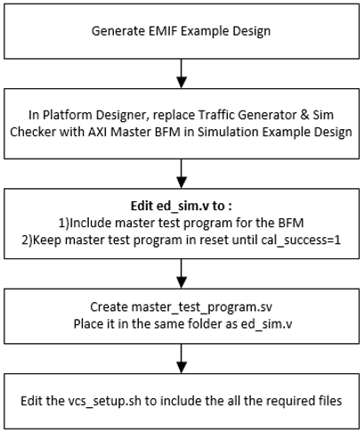 The following figure shows the overall steps and changes required in the simulation design example, to perform functional simulation with the Mentor Graphics* AXI4 Master BFM (Intel FPGA Edition).