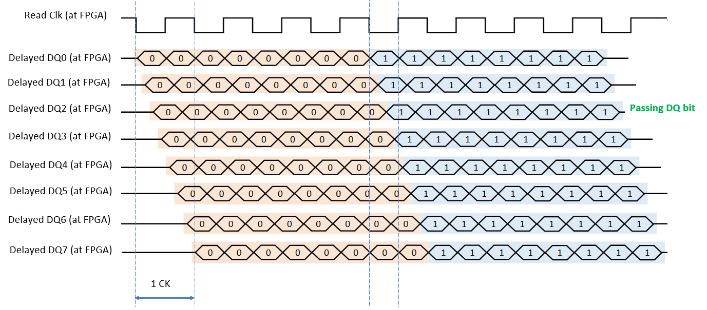 • The algorithm adjusts the DQS output delay (at the FPGA side) while toggling write DQS signal.