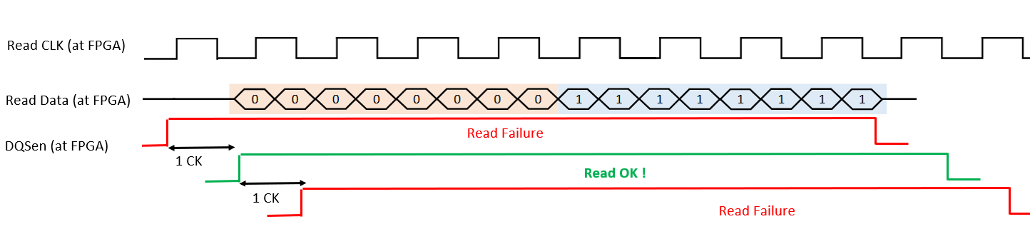 The calibration algorithm does not use a hardware state machine; rather, it calibrates cycle-level delays using software, and subcycle delays using DQS tracking hardware. The algorithm requires good data in memory, and therefore relies on guaranteed writes. The algorithm enables DQS tracking to calibrate the phase component of DQS enable, and then issues a guaranteed write, followed by back-to-back reads. The algorithm sweeps DQSen values cycle by cycle until the read operation succeeds. Because the DQSen calibration occurs before Read Deskew, only one successful data bit is required to register a pass. The algorithm staggers the read DQ bus to ensure that at least one DQ bit falls within the valid Read window.The process then repeats for all other read groups.