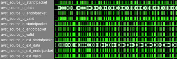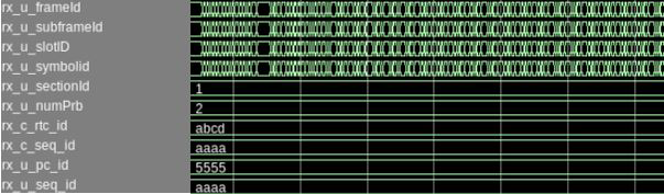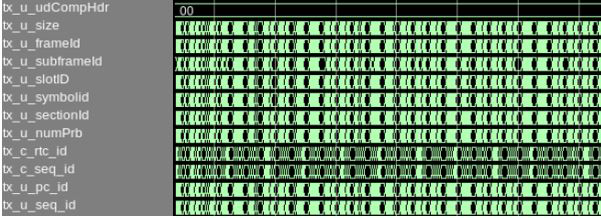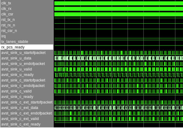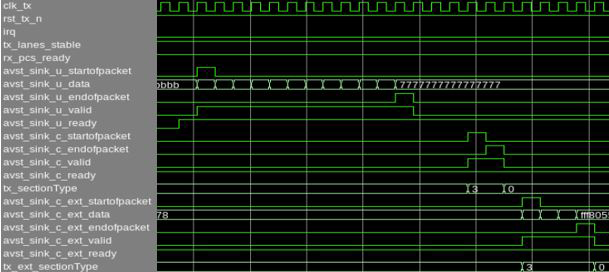Figure 7. Simulation Transcript Window (Number of Channels = 4)# Waiting for RX alignment # RX deskew locked # RX lane aligmnent locked # Waiting for link fault clear # Link fault clear # MAC Source Address 0_0 Channel 0: 33445566 # MAC Source Address 0_1 Channel 0: 00007788 # MAC Destination Address 0_0 Channel 0: 33445566 # MAC Destination Address 0_1 Channel 0: 00007788 # MAC Destination Address 1_0 Channel 0: 11223344 # MAC Destination Address 1_1 Channel 0: 00005566 # MAC Destination Address 2_0 Channel 0: 22334455 # MAC Destination Address 2_1 Channel 0: 00006677 # MAC Destination Address 3_0 Channel 0: 44556677 # MAC Destination Address 3_1 Channel 0: 00008899 # MAC Destination Address 4_0 Channel 0: 66778899 # MAC Destination Address 4_1 Channel 0: 0000aabb # MAC Destination Address 5_0 Channel 0: 778899aa # MAC Destination Address 5_1 Channel 0: 0000bbcc # MAC Destination Address 6_0 Channel 0: 8899aabb # MAC Destination Address 6_1 Channel 0: 0000ccdd # MAC Destination Address 7_0 Channel 0: 99aabbcc # MAC Destination Address 7_1 Channel 0: 0000ddee # eCPRI Common Control Channel 0: 00000041 # Enable interrupt eCPRI Common Control Channel 0: 00000241 # eCPRI version Channel 0: 2 # Disable Oran RX Window Enable Channel 0: 00000000 # Disable Oran TX Window Enable Channel 0: 00000000 # Enable Oran Static Functional Mode Channel 0: 00000000 # Oran Static Static udCompHdr Channel 0: 00000083 # MAC Source Address 0_0 Channel 1: 33445566 # MAC Source Address 0_1 Channel 1: 00007788 # MAC Destination Address 0_0 Channel 1: 33445566 # MAC Destination Address 0_1 Channel 1: 00007788 # MAC Destination Address 1_0 Channel 1: 11223344 # MAC Destination Address 1_1 Channel 1: 00005566 # MAC Destination Address 2_0 Channel 1: 22334455 # MAC Destination Address 2_1 Channel 1: 00006677 # MAC Destination Address 3_0 Channel 1: 44556677 # MAC Destination Address 3_1 Channel 1: 00008899 # MAC Destination Address 4_0 Channel 1: 66778899 # MAC Destination Address 4_1 Channel 1: 0000aabb # MAC Destination Address 5_0 Channel 1: 778899aa # MAC Destination Address 5_1 Channel 1: 0000bbcc # MAC Destination Address 6_0 Channel 1: 8899aabb # MAC Destination Address 6_1 Channel 1: 0000ccdd # MAC Destination Address 7_0 Channel 1: 99aabbcc # MAC Destination Address 7_1 Channel 1: 0000ddee # eCPRI Common Control Channel 1: 00000041 # Enable interrupt eCPRI Common Control Channel 1: 00000241 # eCPRI version Channel 1: 2 # Disable Oran RX Window Enable Channel 1: 00000000 # Disable Oran TX Window Enable Channel 1: 00000000 # Enable Oran Static Functional Mode Channel 1: 00000000 # Oran Static Static udCompHdr Channel 1: 00000083 # MAC Source Address 0_0 Channel 2: 33445566 # MAC Source Address 0_1 Channel 2: 00007788 # MAC Destination Address 0_0 Channel 2: 33445566 # MAC Destination Address 0_1 Channel 2: 00007788 # MAC Destination Address 1_0 Channel 2: 11223344 # MAC Destination Address 1_1 Channel 2: 00005566 # MAC Destination Address 2_0 Channel 2: 22334455 # MAC Destination Address 2_1 Channel 2: 00006677 # MAC Destination Address 3_0 Channel 2: 44556677 # MAC Destination Address 3_1 Channel 2: 00008899 # MAC Destination Address 4_0 Channel 2: 66778899 # MAC Destination Address 4_1 Channel 2: 0000aabb # MAC Destination Address 5_0 Channel 2: 778899aa # MAC Destination Address 5_1 Channel 2: 0000bbcc # MAC Destination Address 6_0 Channel 2: 8899aabb # MAC Destination Address 6_1 Channel 2: 0000ccdd # MAC Destination Address 7_0 Channel 2: 99aabbcc # MAC Destination Address 7_1 Channel 2: 0000ddee # eCPRI Common Control Channel 2: 00000041 # Enable interrupt eCPRI Common Control Channel 2: 00000241 # eCPRI version Channel 2: 2 # Disable Oran RX Window Enable Channel 2: 00000000 # Disable Oran TX Window Enable Channel 2: 00000000 # Enable Oran Static Functional Mode Channel 2: 00000000 # Oran Static Static udCompHdr Channel 2: 00000083 # MAC Source Address 0_0 Channel 3: 33445566 # MAC Source Address 0_1 Channel 3: 00007788 # MAC Destination Address 0_0 Channel 3: 33445566 # MAC Destination Address 0_1 Channel 3: 00007788 # MAC Destination Address 1_0 Channel 3: 11223344 # MAC Destination Address 1_1 Channel 3: 00005566 # MAC Destination Address 2_0 Channel 3: 22334455 # MAC Destination Address 2_1 Channel 3: 00006677 # MAC Destination Address 3_0 Channel 3: 44556677 # MAC Destination Address 3_1 Channel 3: 00008899 # MAC Destination Address 4_0 Channel 3: 66778899 # MAC Destination Address 4_1 Channel 3: 0000aabb # MAC Destination Address 5_0 Channel 3: 778899aa # MAC Destination Address 5_1 Channel 3: 0000bbcc # MAC Destination Address 6_0 Channel 3: 8899aabb # MAC Destination Address 6_1 Channel 3: 0000ccdd # MAC Destination Address 7_0 Channel 3: 99aabbcc # MAC Destination Address 7_1 Channel 3: 0000ddee # eCPRI Common Control Channel 3: 00000041 # Enable interrupt eCPRI Common Control Channel 3: 00000241 # eCPRI version Channel 3: 2 # Disable Oran RX Window Enable Channel 3: 00000000 # Disable Oran TX Window Enable Channel 3: 00000000 # Enable Oran Static Functional Mode Channel 3: 00000000 # Oran Static Static udCompHdr Channel 3: 00000083 # __________________________________________________________ # INFO: Out of reset status # __________________________________________________________ # # # Channel 0 Oran TX C SOPs count : 0 # Channel 0 Oran TX C EOPs count : 0 # Channel 0 Oran RX C SOPs count : 0 # Channel 0 Oran RX C EOPs count : 0 # Channel 0 Oran TX U SOPs count : 0 # Channel 0 Oran TX U EOPs count : 0 # Channel 0 Oran RX U SOPs count : 0 # Channel 0 Oran RX U EOPs count : 0 # Channel 0 External PTP TX SOPs count : 0 # Channel 0 External PTP TX EOPs count : 0 # Channel 0 External MISC TX SOPs count : 0 # Channel 0 External MISC TX EOPs count : 0 # Channel 0 External RX SOPs count : 0 # Channel 0 External RX EOPs count : 0 # Channel 1 Oran TX C SOPs count : 0 # Channel 1 Oran TX C EOPs count : 0 # Channel 1 Oran RX C SOPs count : 0 # Channel 1 Oran RX C EOPs count : 0 # Channel 1 Oran TX U SOPs c