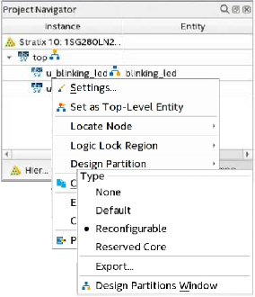 - In the Project Navigator, right-click an instance in the Hierarchy tab, click Design Partition > Set as Design Partition.