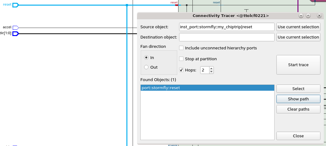 In the following image, the source object is the instance port i5 with a port name o, and the destination object is the instance port ticket[o] with a port name ce. When you trace this path, the Found Objects field lists only one path. When you view this path using Show path, the schematic viewer auto-highlights the path between the source and destination objects.